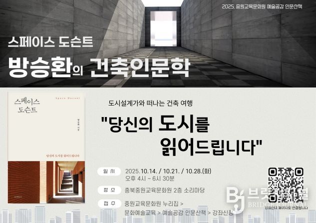 브릿지저널 김경미 기자 | 충청북도교육청 직속기관 중원교육문화원(원장 배상근)은 교육공동체 구성원들의 인문적 소양과 예술적 감수성을 높이기 위해 운영중인 문화교육 프로그램 '예술공감 인문산책'의 10월 강연 수강생을 선착순 모집한다고 전했다.