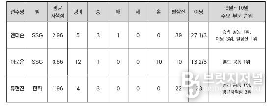 SSG 앤더슨은 9~10월 5경기에 선발 등판해 3승을 거두며 승리 부문 공동 1위에 올랐다. 평균자책점 2.96을 기록했고, 삼진 39개를 잡아내며 탈삼진 부문 월간 1위를 차지했다. 앤더슨은 9~10월 경기 당 평균 8개에 가까운 탈삼진을 잡으며 245탈삼진으로 정규시즌을 마무리했다.