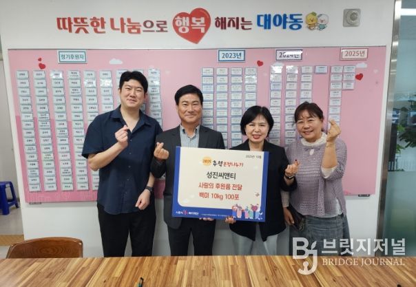 한성운 ㈜성진씨앤티 대표는 “대야동의 한 기업으로서 지역사회에 도움이 되고 싶어 기부를 결심했다”라며 “이번에 전달된 쌀이 추석을 앞두고 어려운 이웃들에게 작은 힘이 되길 바란다”라고 말했다.