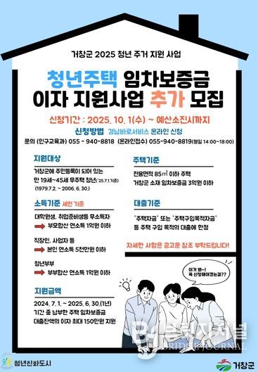 브릿지저널 김경미 기자 | 거창군은 2025년 청년주택 임차보증금 이자 지원 사업 참여자를 10월 1일부터 예산 소진 때까지 수시로 모집한다고 밝혔다.