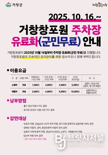 브릿지저널 김경미 기자 | 거창군은 거창창포원 운영 유지비를 일부 충당하고, 국가정원 승격을 위한 기반 조성을 위해 2025년 10월 16일부터 주차장을 유료화한다고 밝혔다.