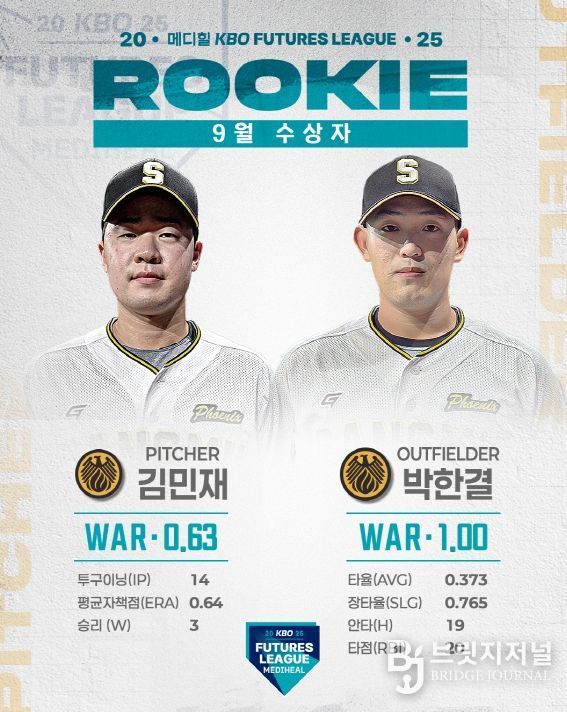 브릿지저널 김경미 기자 | 2025 메디힐 KBO 퓨처스리그의 9월 퓨처스 루키상 수상자로 투수 부문에는 상무 김민재가 WAR 0.63, 타자 부문에는 상무 박한결이 WAR 1.00을 기록하며 각각 선정됐다.