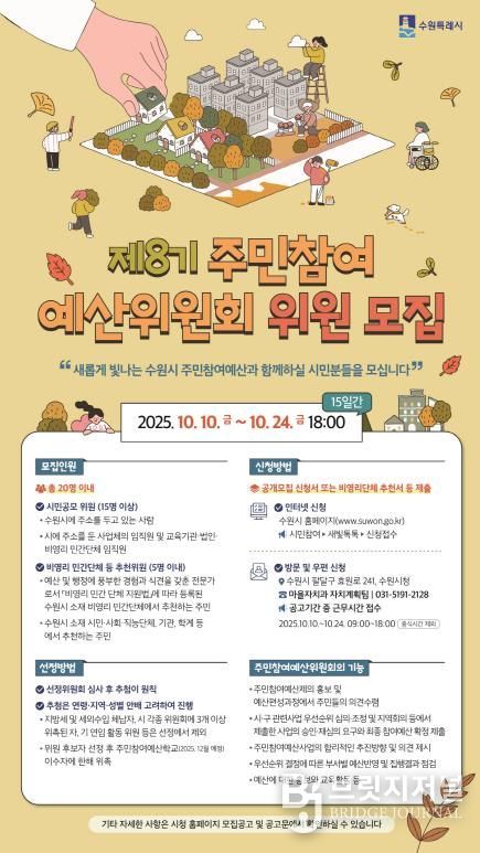 브릿지저널 김경미 기자 | 수원특례시는 10월 24일까지 제8기 주민참여예산위원회 위원을 공개 모집한다.