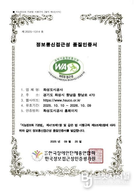 브릿지저널 김경미 기자 | 화성도시공사는 시각장애인, 고령자 등 정보 취약계층도 불편 없이 홈페이지를 이용할 수 있도록 지속적으로 개선해온 결과, 3년 연속 ‘웹 접근성 품질인증마크’를 획득했다고 10일 밝혔다.