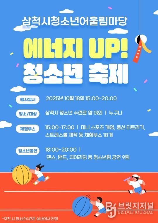 브릿지저널 윤나영 기자 | 삼척시청소년수련관은 오는 10월 18일 오후 3시부터 관내 청소년과 가족을 대상으로 2025 삼척시청소년어울림마당 『에너지 UP! 청소년축제』를 개최한다.