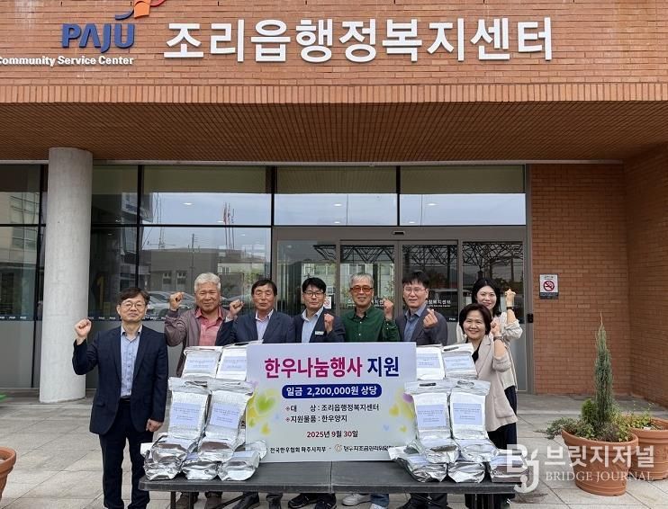 브릿지저널 김경미 기자 | 파주시 조리읍은 지난 9월 30일 전국한우협회 파주시지부로부터 추석 명절을 맞아 220만 원 상당의 한우 양지 43kg을 기탁 받았다고 전했다.