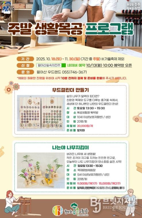 브릿지저널 김경미 기자 | 진주시는 오는 18일부터 ‘월아산 숲속의 진주’에서 시민들의 다양한 목공체험과 이를 실용적 생활목공의 경험으로 확대하기 위한 ‘주말 생활목공’ 프로그램을 운영한다고 밝혔다.