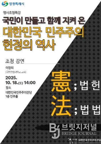 브릿지저널 김경미 기자 | 창원특례시는 오는 10월 18일 오후 2시, 대한민국민주주의전당 민주홀에서 ‘대한민국 민주주의 헌정의 역사’ 특별 강연을 개최한다고 밝혔다.