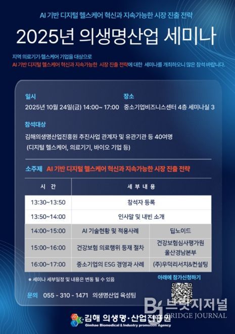 브릿지저널 김경미 기자 | 김해의생명·산업진흥원은 오는 24일에 『2025년 의생명산업 세미나』를 개최한다.