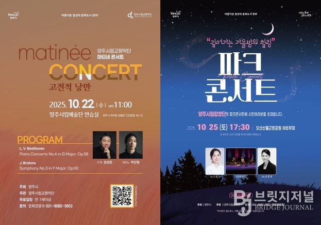 양주시가 깊어가는 가을 정취 속에서 시민들에게 품격 있는 문화예술 향유 기회를 제공하기 위해 오는 22일 ‘마티네 콘서트’와 25일 ‘파크콘서트’를 연이어 개최한다.