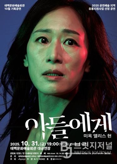 브릿지저널 윤나영 기자 | 태백시는 태백문화예술회관 10월 기획공연으로 연극 '아들에게(부제: 미옥 앨리스 현)'을 오는 10월 31일 오후 7시, 태백문화예술회관 대공연장에서 선보인다고 밝혔다.