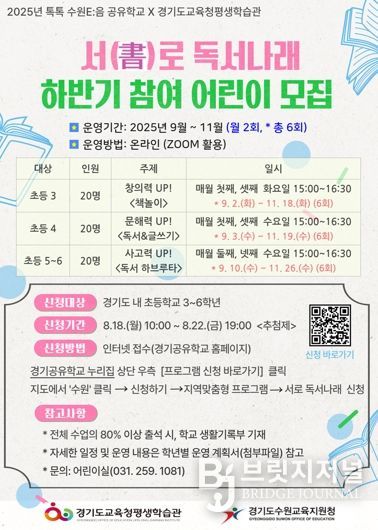 브릿지저널 김경미 기자 | 경기도교육청평생학습관이 수원교육지원청과 함께 어린이 독서 습관 형성과 사고력 향상을 위하여 초등학교 3~6학년을 대상으로‘서(書)로 독서나래’를 운영한다.