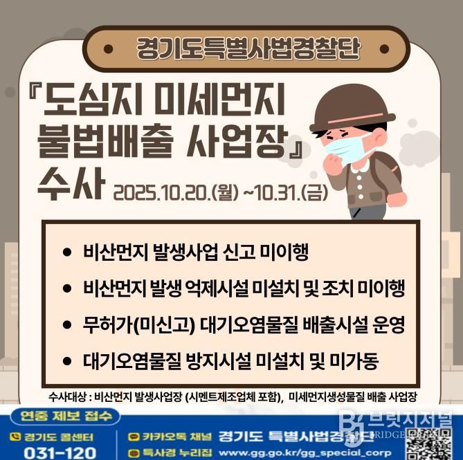 브릿지저널 김경미 기자 | 경기도 특별사법경찰단은 오는 20일부터 31일까지 2주간, 도심지 내 미세먼지 주요 발생 사업장을 대상으로 불법행위를 집중 수사한다.