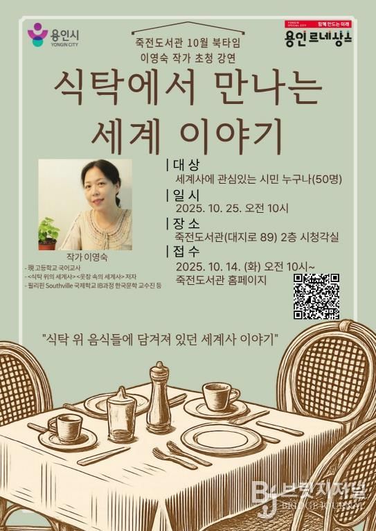브릿지저널 김경미 기자 | 용인특례시는 25일 오전 10시 죽전도서관 시청각실에서 죽전도서관 북타임 작가초청강연회 ‘식탁에서 만나는 세계 이야기’를 연다고 13일 밝혔다.