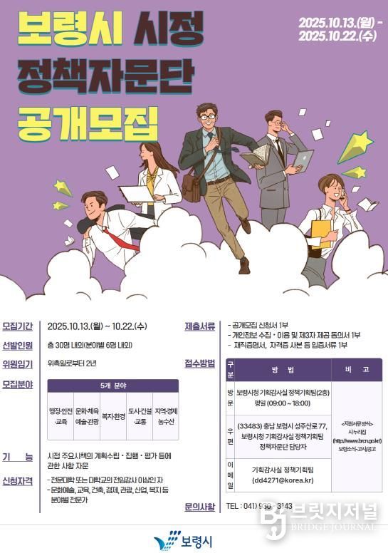 브릿지저널 정보영 기자 | 보령시는 지역 시정 발전에 대해 조언·권고·건의 등의 자문을 얻고자 보령시 시정 정책자문단 신규 위원을 10월 13일부터 22일까지 10일간 공개 모집한다고 밝혔다.