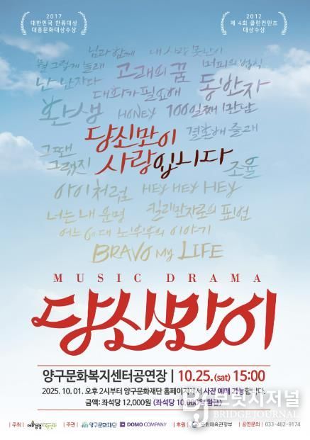 브릿지저널 윤나영 기자 | 양구문화재단은 깊어가는 가을, 가족 모두가 함께 즐길 수 있는 뮤지컬 ‘당신만이’를 오는 25일 오후 3시, 양구문화복지센터 공연장에서 선보인다.