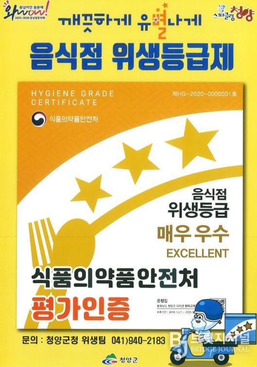 브릿지저널 정보영 기자 | 청양군은 철저한 위생 관리로 안심하고 이용할 수 있는 음식점을 확대하기 위해 음식점 위생등급제 지정 신청업소를 연중 모집한다고 밝혔다.
