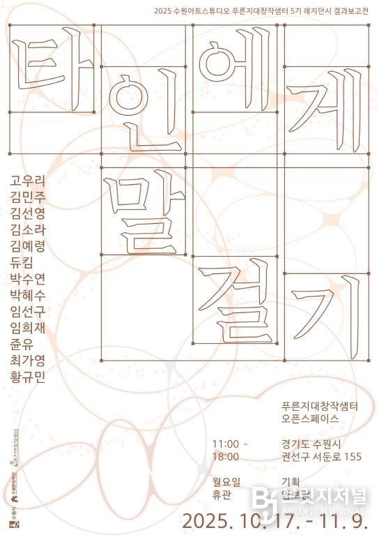 브릿지저널 김경미 기자 | 수원문화재단은 오는 10월 17일부터 11월 9일까지 약 3주간 탑동 시민농장에 자리한 수원아트스튜디오 푸른지대창작샘터에서 5기 레지던시 참여작가 13인의 올 한 해 작품 활동 성과를 공유하는 결과보고전 '타인에게 말 걸기'를 개최한다.