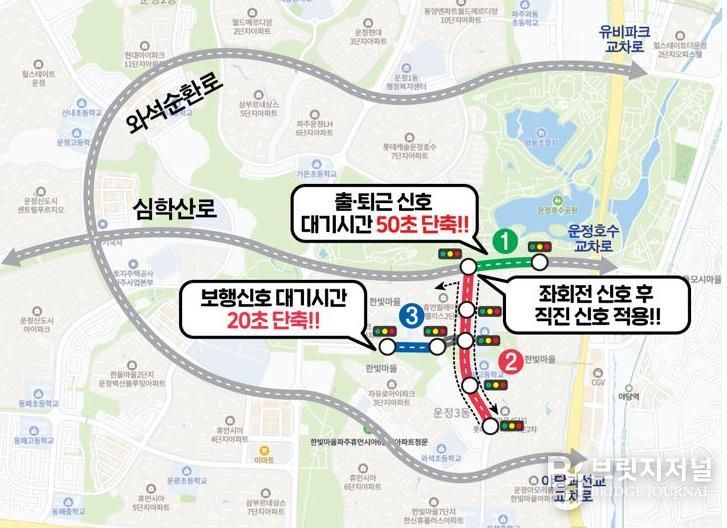 브릿지저널 김경미 기자 | 파주시는 출퇴근 시간대에 신호주기가 길어 불편했던 운정 한빛마을 5단지 및 2·5단지 소도로 일대 구간의 신호체계를 우선적으로 개선했다고 밝혔다.