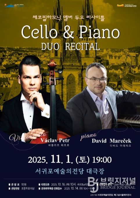 브릿지저널 정보영 기자 | 서귀포시는 11월 1일 오후 7시, 서귀포예술의전당 대극장에서 체코필하모닉오케스트라 멤버 '첼로 & 피아노 듀오 리사이틀'을 개최한다고 밝혔다.