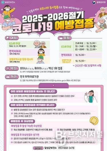 브릿지저널 김진석 기자 | 달성군은 오는 10월 15일부터 2026년 4월 30일까지 ‘2025-2026절기 코로나19 예방접종’을 실시한다고 밝혔다.