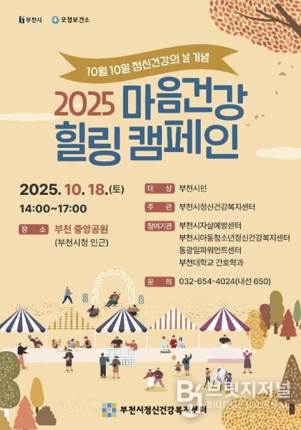 브릿지저널 김경미 기자 | 부천시는 부천시정신건강복지센터와 함께 2025년 정신건강의 날(10월 10일)을 기념해 10월 18일 오후 2시부터 부천중앙공원에서 ‘2025 마음건강 힐링캠페인’을 연다.
