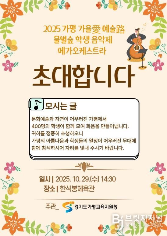브릿지저널 김경미 기자 | 경기도가평교육지원청이 주관하는 ‘2025 가평 가을愛 예술路 물별숲 학생 음악제 메가오케스트라’가 10월 29일 오후 2시 30분, 가평군 한석봉체육관에서 열린다.