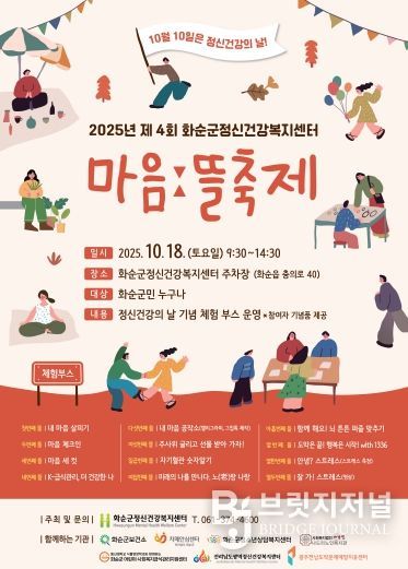 브릿지저널 김경미 기자 | 화순군은 ‘10월 10일 세계정신건강의 날’을 기념하여 정신건강에 대한 인식을 개선하고 정신건강에 대한 중요성을 널리 알리고자 화순군정신건강복지센터에서 '마음ː뜰 축제'를 개최한다고 밝혔다.