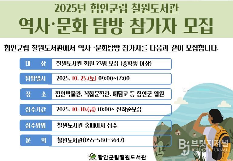 브릿지저널 김경미 기자 | 함안군립 칠원도서관이 '2025년 하반기 역사·문화탐방' 프로그램 참가자를 모집한다.