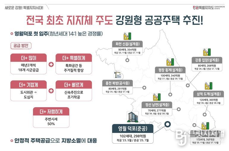 브릿지저널 윤나영 기자 | 강원특별자치도는 청년과 신혼부부 등 지역 정착 인구 확대를 위한 안정적인 주택공급을 목표로 전국 최초의 지자체 주도형 주거모델인 강원형 공공주택 사업을 적극 추진하고 있다고 밝혔다.