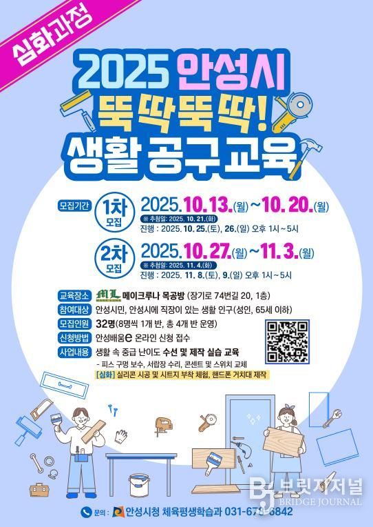 브릿지저널 김경미 기자 | 안성시는 시민들의 생활 자립 역량 강화를 위해 '뚝딱뚝딱 생활 공구[심화과정] 교육'을 오는 10월 25~26일과 11월 8~9일, 총 2회 주말 일정으로 운영한다고 밝혔다.