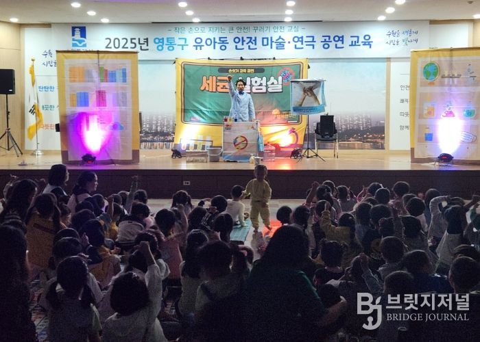 브릿지저널 김경미 기자 | 수원시 영통구는 2025. 10. 13. 영통구청 대회의실에서 관내 유아를 대상으로 안전한 위생 습관을 형성하기 위한 ‘찰리박사의 세균실험실’ 체험형 안전마술·연극 공연 교육을 실시했다.