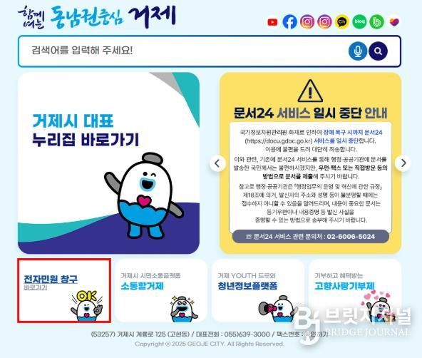 브릿지저널 김경미 기자 | 거제시는 국가전산망 화재로 인한 국민신문고 시스템 장애로 시민 불편을 줄이기 위해 10월 13일부터 ‘새올전자민원창구’를 임시 운영한다고 밝혔다.