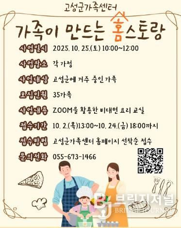 브릿지저널 김경미 기자 | 고성군가족센터는 오는 10월 24일까지 집에서 즐기는 비대면 요리프로그램'가족이 만드는 홈스토랑'참여 가족을 모집한다고 밝혔다.