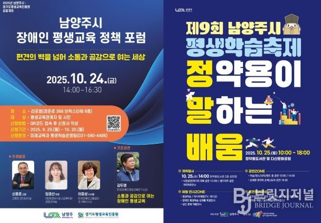 브릿지저널 김경미 기자 | 남양주시는 장애인과 비장애인이 함께 어우러지는 평생학습 환경 조성과 모두를 위한 평생학습 가치공유 및 활성화를 위해 오는 24일 ‘장애인 평생학습포럼’, 25일 ‘평생학습축제’를 연이어 개최한다고 밝혔다.