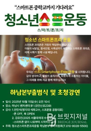 브릿지저널 김경미 기자 | 15일 오전 10시, 하남시 벤처센터에서 ‘청소년 스마트폰 프리 운동(Smartphone-Free)’ 하남본부 출범식을 갖는다.
