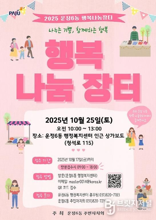 브릿지저널 김경미 기자 | 파주시 운정6동 주민자치회는 오는 25일 10시부터 13시까지 운정6동 행정복지센터 앞에서 주민과 함께하는 ‘제3회 행복나눔장터’를 개최한다.