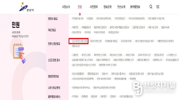 브릿지저널 김경미 기자 | 안산시는 지난 13일부터 ‘국민신문고’ 시스템 장애에 대응해 안산시청 누리집에 ‘임시 온라인 민원 신청’ 창구를 설치하고 운영을 시작했다고 14일 밝혔다.
