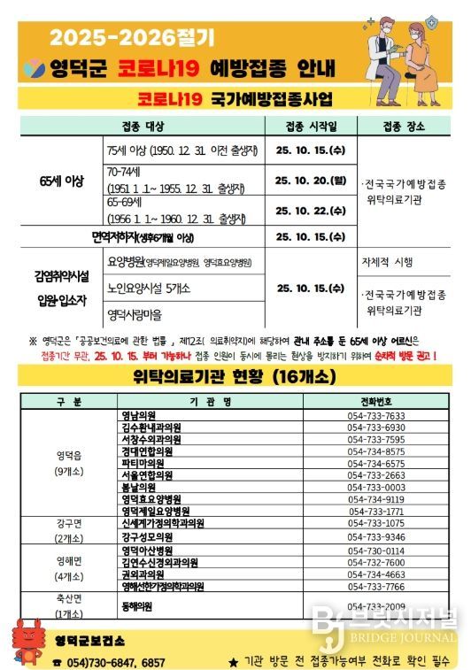 브릿지저널 정보영 기자 | 영덕군은 겨울철 감염병 유행에 대비해 오는 15일부터 내년 4월 30일까지 코로나19 예방접종을 시작한다.