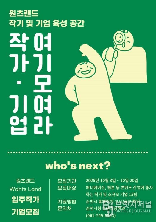 브릿지저널 김경미 기자 | 순천시는 문화콘텐츠산업 활성화를 위해 오는 20일까지 ‘문화콘텐츠 작가 및 소규모 기업 육성 공간’ 입주 모집을 한다고 밝혔다.