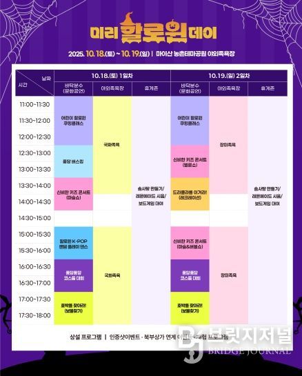 마이산 북부 야외족욕장에서는 매월 새로운 주제로 다양한 이벤트를 선보이고 있으며 이번 10월 특별 행사는 할로윈 데이를 주제로 △할로윈 코스튬 대회 △어린이 쿠킹클래스 △신비한 키즈 콘서트(마술&버블쇼) △할로윈 타로체험 등 다채로운 프로그램이 마련된다. 행사는 양일간 오전 11시부터 오후 6시까지 진행되며 일부 행사는 SNS 등을 활용해 사전 신청을 받아 운영된다.
