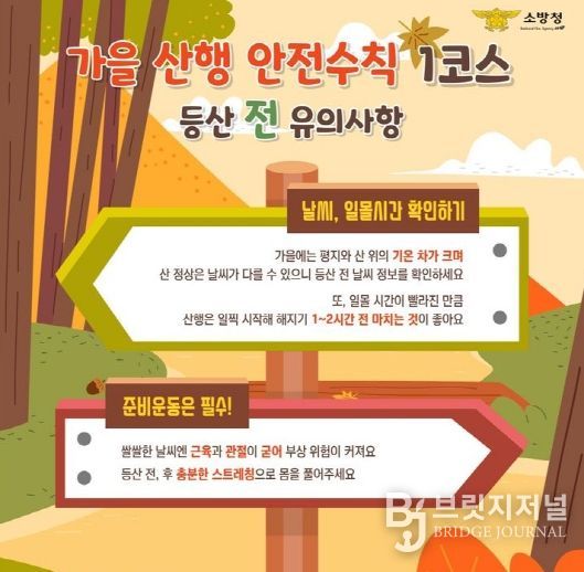 브릿지저널 정보영 기자 | 천안서북소방서는 본격적인 가을 산행철을 맞아 시민들에게 안전한 산행을 위한 ‘가을 산행 안전수칙’을 지켜줄 것을 당부했다.