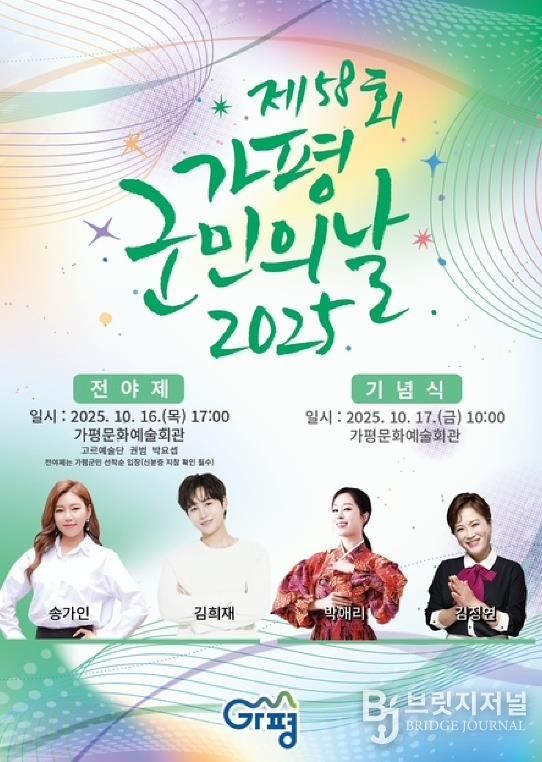 브릿지저널 김경미 기자 | 가평군은 오는 16일 오후 5시, 새롭게 리모델링을 마친 가평문화예술회관에서 ‘제58회 가평군민의 날 전야제’를 개최한다. 이번 행사는 ‘다시, 가평으로’를 슬로건으로 내세워 수해 극복과 지역 재도약을 기원하며 군민 화합의 의미를 담아 열린다.