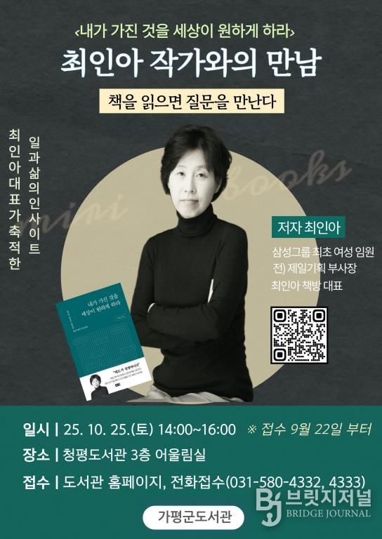 브릿지저널 김경미 기자 | 가평군은 이달 25일 오후 2시 청평도서관에서 ‘2025년 정기 작가와의 만남’ 강연을 개최한다. 이번 강연은 ‘최인아 책방’ 대표로 잘 알려진 최인아 작가를 초청해 ‘책을 읽으면 질문을 만난다’를 주제로 열린다.