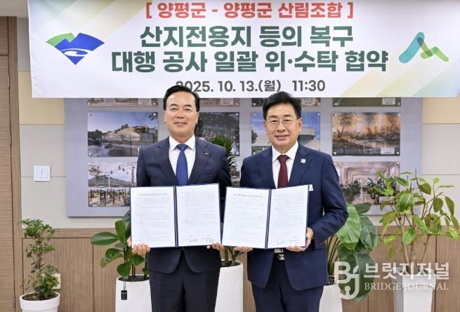 브릿지저널 김경미 기자 | 양평군은 지난 13일 양평군청에서 양평군산림조합과 ‘산지전용지 등의 복구 대행 공사’에 대한 위·수탁 협약을 전국 최초로 체결했다고 밝혔다.