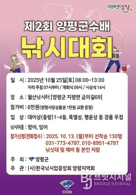 브릿지저널 김경미 기자 | 양평군은 오는 25일 관내 월산낚시터에서 ‘제2회 양평군수배 낚시 대회’를 개최한다고 밝혔다.