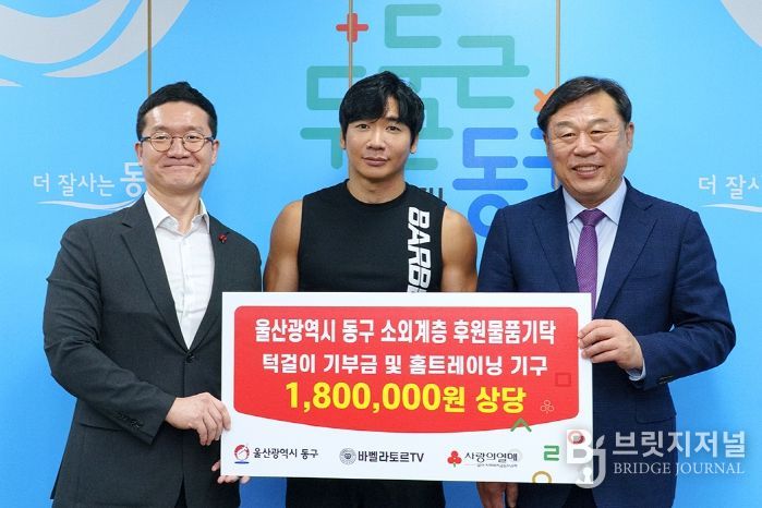 브릿지저널 윤나영 기자 | 운동 유튜브 채널 ‘바벨라토르’(대표 이정희)가 10월 14일 오후 3시 동구청을 방문해, 지난 9월 13일 일산해수욕장 중앙광장에서 ‘턱걸이 왕중왕전’을 진행하고 모금한 기부금과 운동 물품 등 180만 원 상당을 동구에 기부했다.