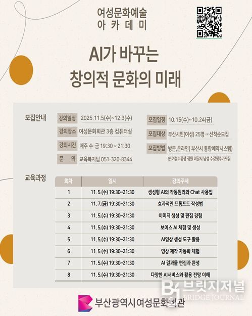 브릿지저널 윤나영 기자 | 부산시 여성문화회관은 오는 11월 5일부터 12월 3일까지 '에이아이(AI)가 바꾸는 창의적 문화의 미래'를 주제로 '2025년 여성 문화예술 아카데미'를 운영한다고 밝혔다.