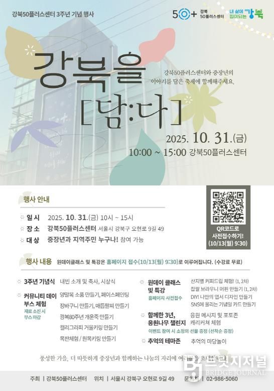 브릿지저널 김경미 기자 | 서울 강북구는 오는 10월 31일 오전 10시부터 오후 3시까지 강북50플러스센터에서 개관 3주년을 기념하는 축제 ‘강북을 [담:다]’가 개최된다고 밝혔다.