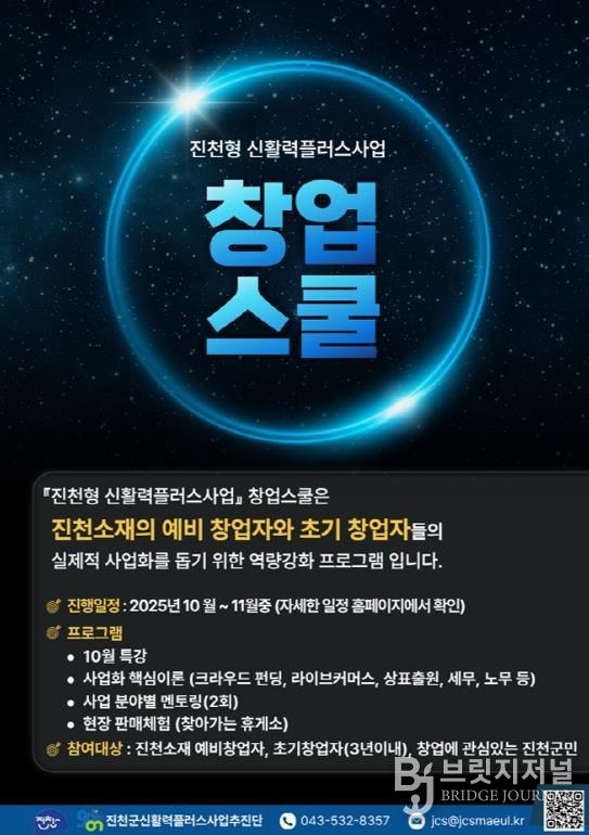 브릿지저널 김경미 기자 | 충북 진천군 신활력플러스사업 추진단은 오는 11월까지 약 2개월간 지역 창업 역량을 높이고, 창업 꿈을 현실로 만드는 ‘진천형 신활력플러스사업 창업스쿨’을 본격 운영한다고 15일 밝혔다.